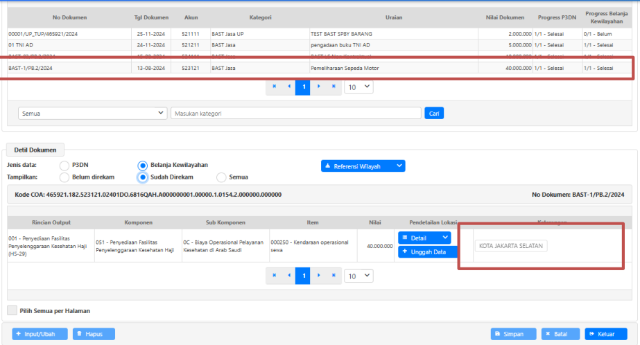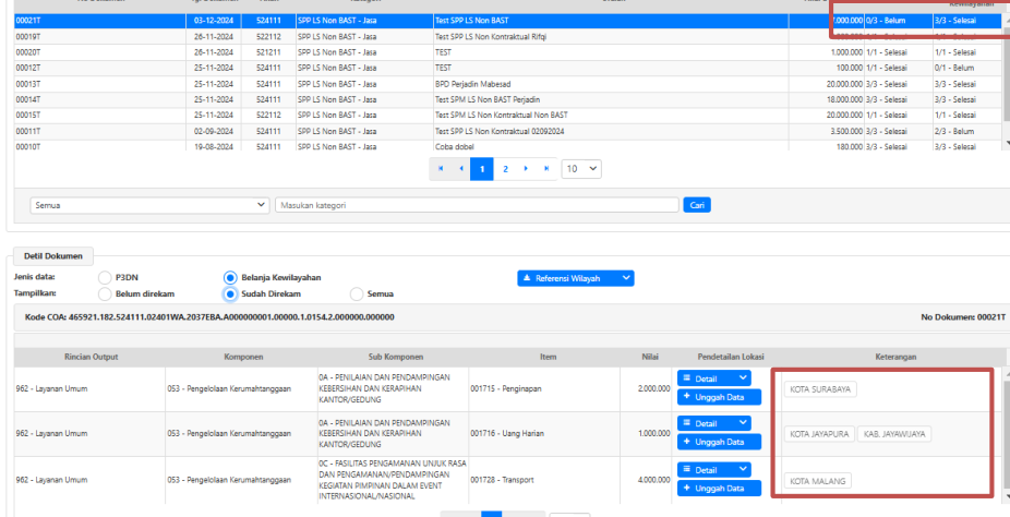 i) Setelah dilakukan perekaman maka akan tertampil progres belanja kewilayahan 1/1
