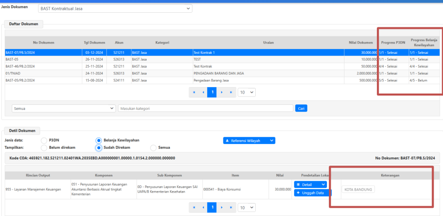 j) Setelah dilakukan perekaman maka akan tertampil progres belanja kewilayahan 1/1