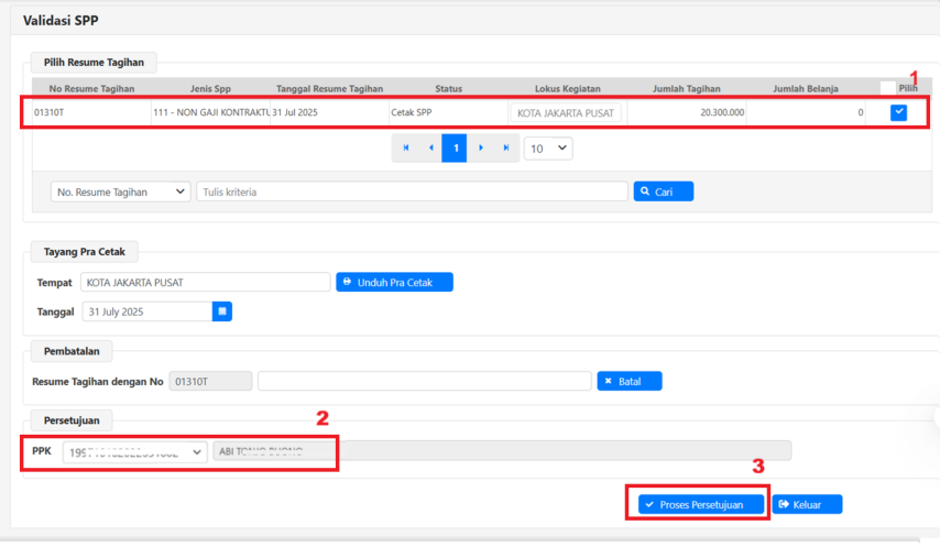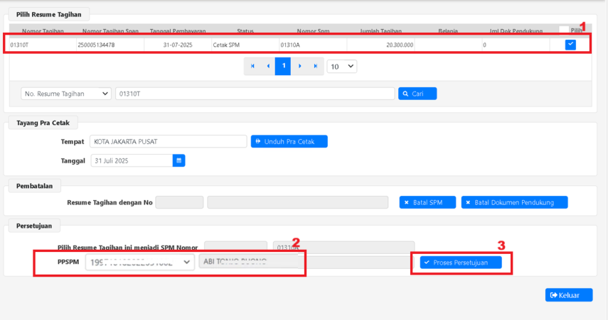 3. Klik “Proses Persetujuan” (saat setuju SPM oleh PPSPM, SAKTI mengirim no SPM ke