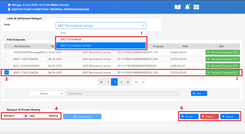 1. Pilih Jenis Dokumen “BAST Kontraktual” atau “BAST Kontraktual Lainnya”;