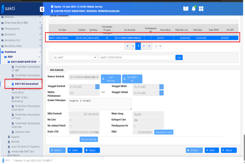 Lakukan pengecekan data BAST Kontraktual yang telah diproses sebelumnya, pada menu