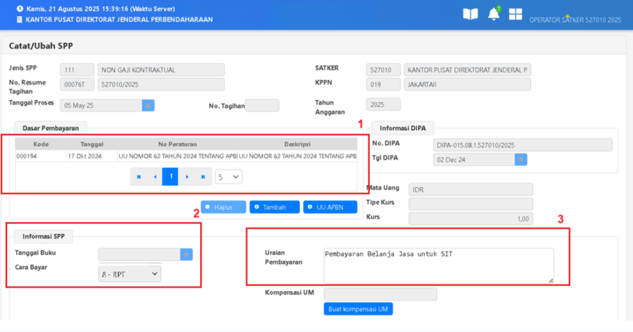 1. Dasar Pembayaran : Klik Tambah atau UU APBN (untuk default APBN);