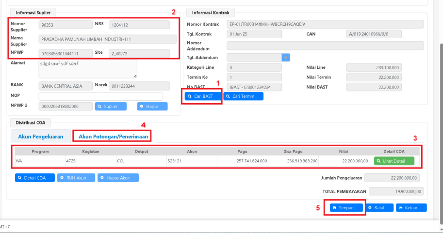 Informasi Supplier, BAST, akun pengeluaran dan akun Potongan sebagai berikut:
