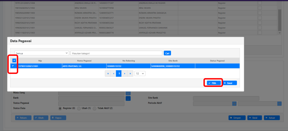 2. Pilih pegawai yanf akan dibayarkan gajinya dengan mengisi checklist pada nama