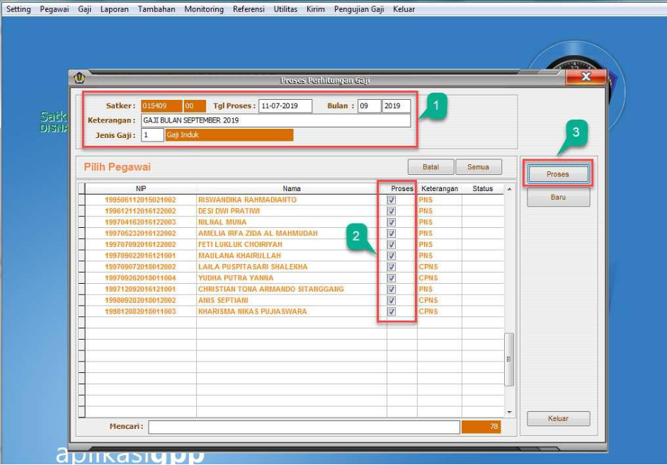 dari aplikasi GPP. Kemudian pilih dengan mengisi checklist atas pegawai mana saja