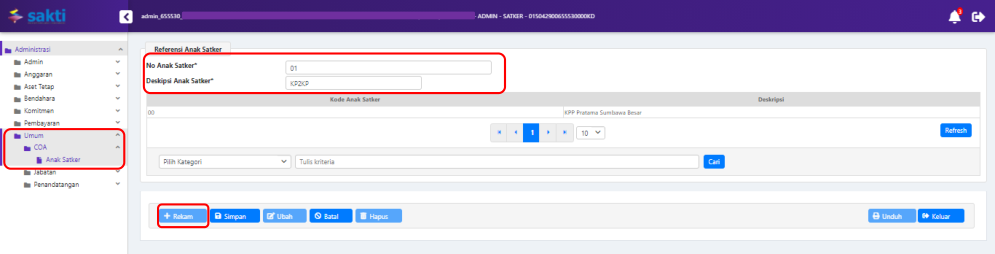 1. Masuk ke Modul Administrasi → Umum → COA → Anak Satker
