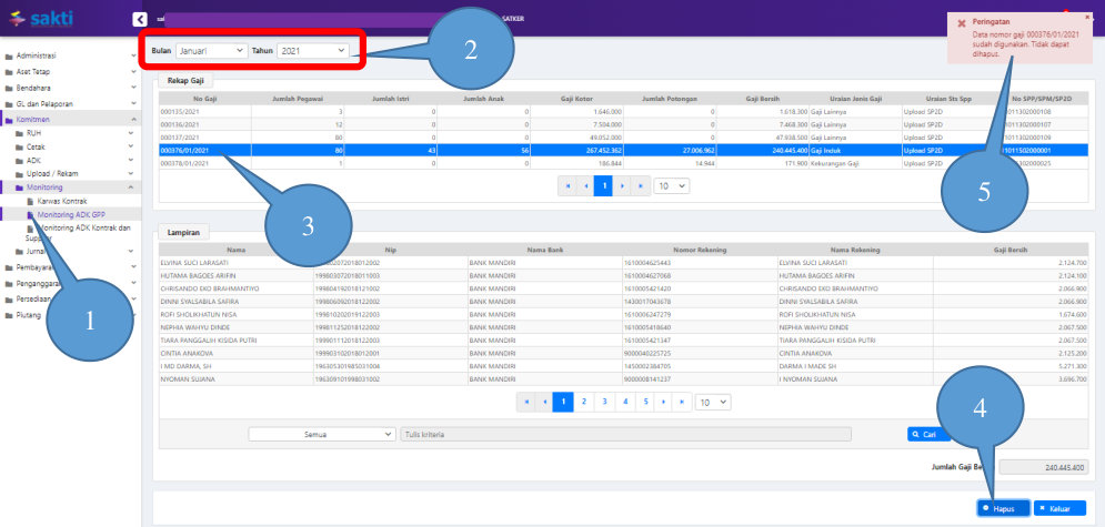 5. Muncul notifikasi bahwa Data nomor gaji sudah digunakan, Tidak dapat dihapus