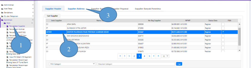 dengan deskripsi jenis supplier “SATKER” dan Site Address dengan digit awal “3”,