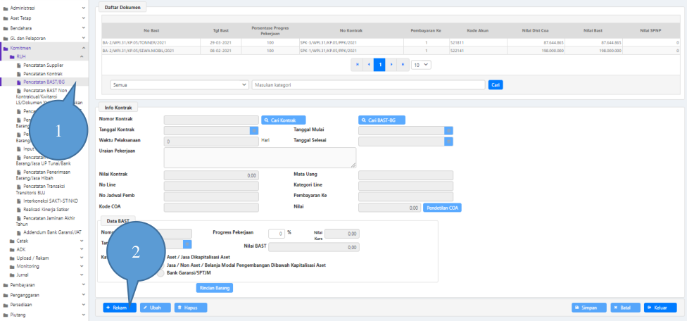 dengan perekaman BAST kontrak melalui menu Komitmen → RUH → Pencatatan
