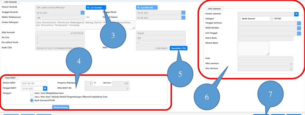 6. Isikan informasi Bank Garansi/BAST dengan mengklik tombol kaca pembesar di