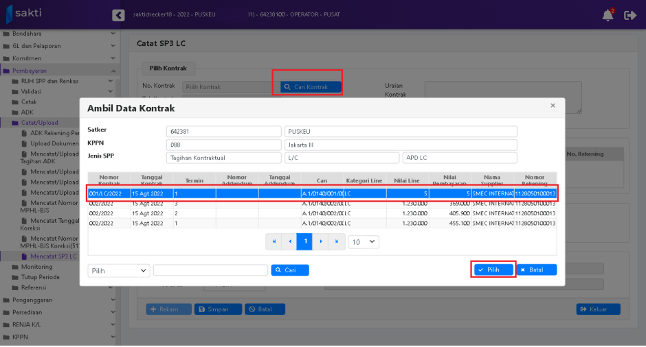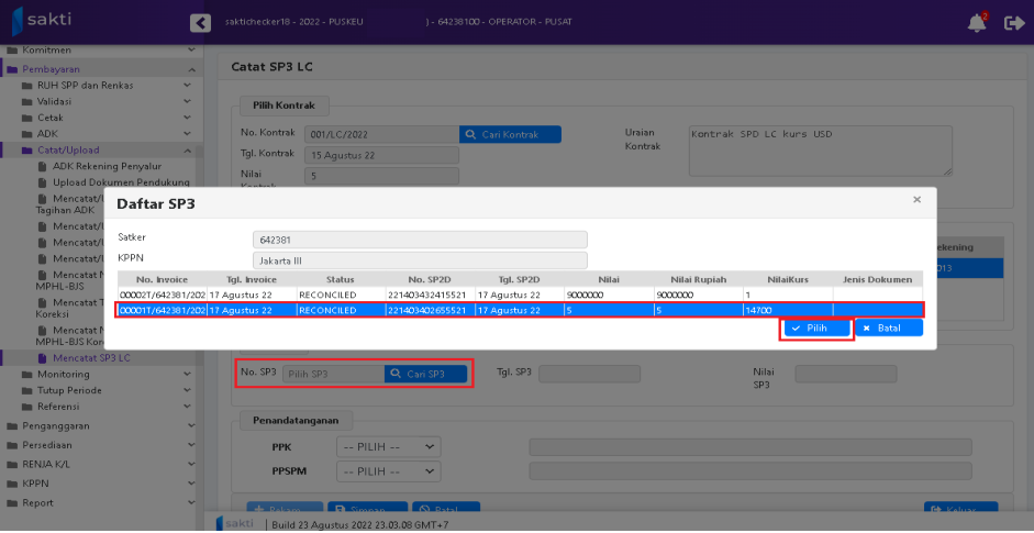 2. Kemudian muncul Pop Up Box, pilih data kontrak LC yang akan dilakukan pencatatan SP3-LC.