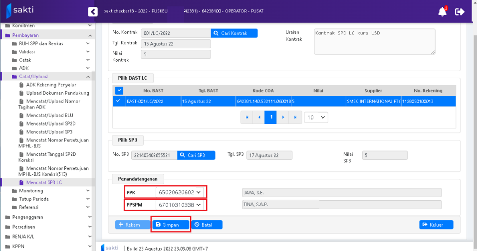 dilakukan pencatatan SP3-LC di SAKTI, dengan penjelasan sbb: