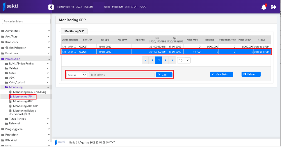 - Statusnya adalah ”Upload SP2D”.