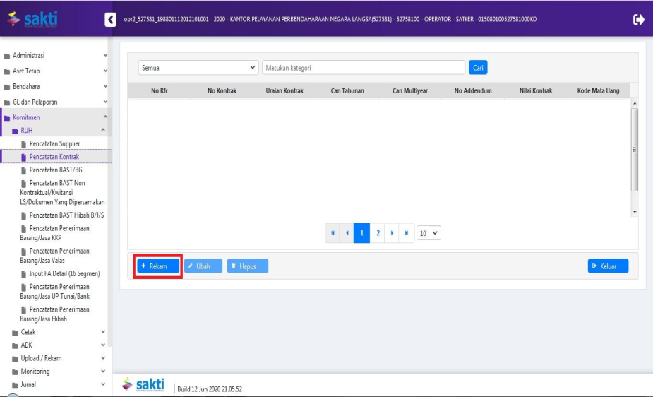 Masuk ke menu : Komitmen – RUH – Pencatatan Kontrak – Rekam