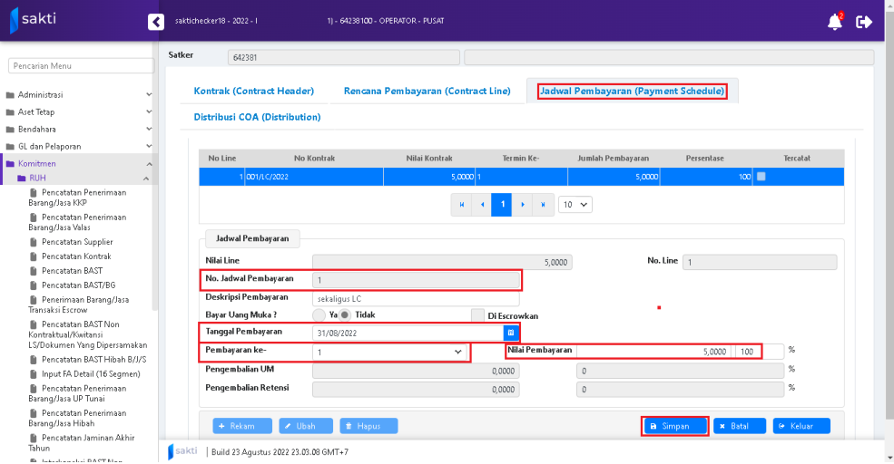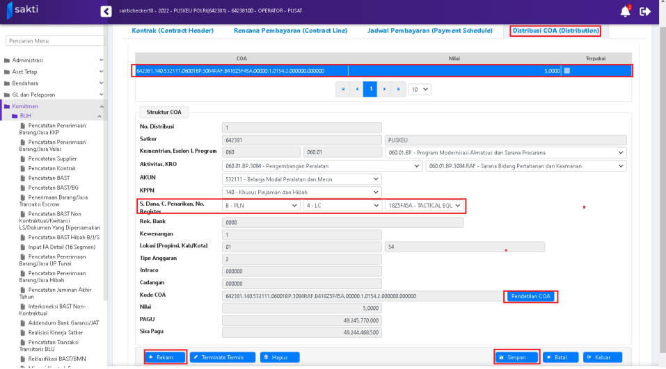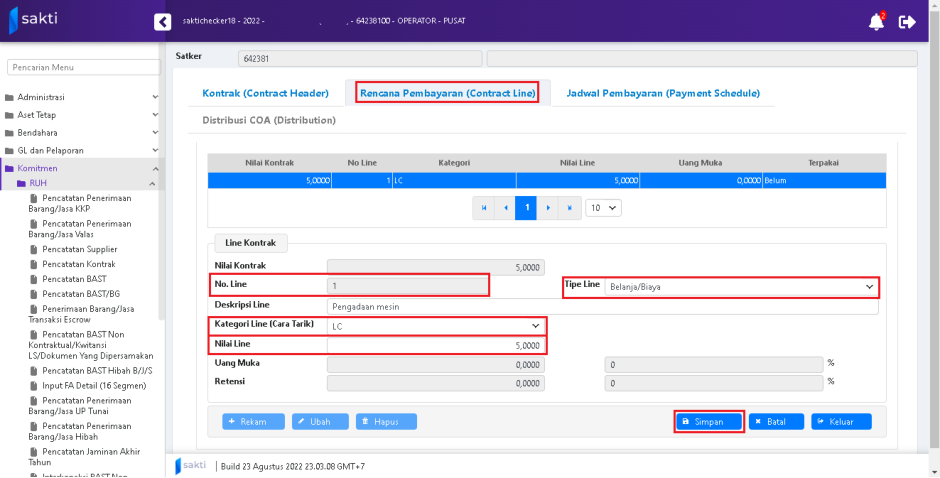Tekan tombol “Rekam” untuk melakukan perekaman rencana pembayaran (Contract Line). Lengkapi