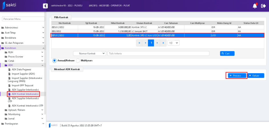 - ADK – ADK Kontrak Interkoneksi. Pilih kontrak yang akan dibentuk ADK-nya kemudian tekan tombol