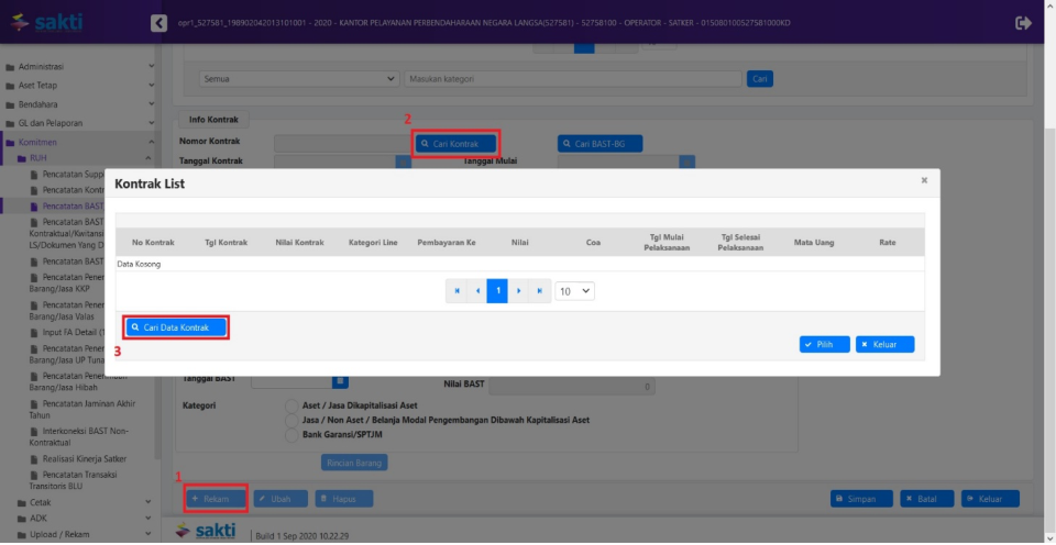 - Kemudian muncul Pop Up Box daftar kontrak yang dapat digunakan dalam perekaman BAST