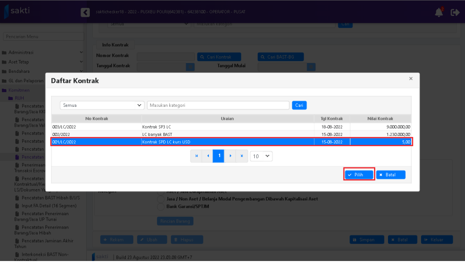 2. Klik tombol “Pilih” atas Kontrak yang digunakan.