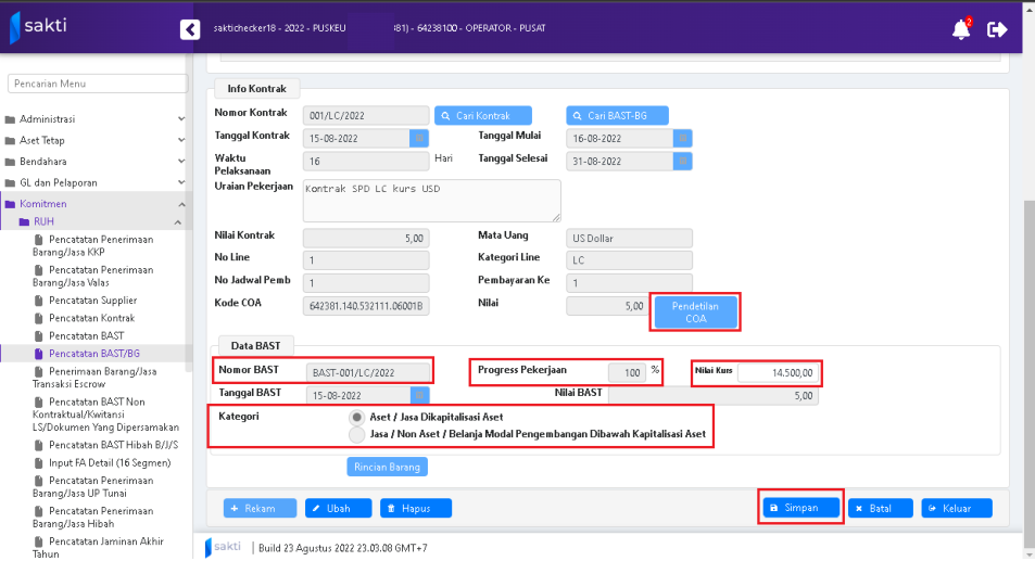 6. Klik tombol “Simpan” untuk menyimpan BAST Kontraktual yang telah direkam.