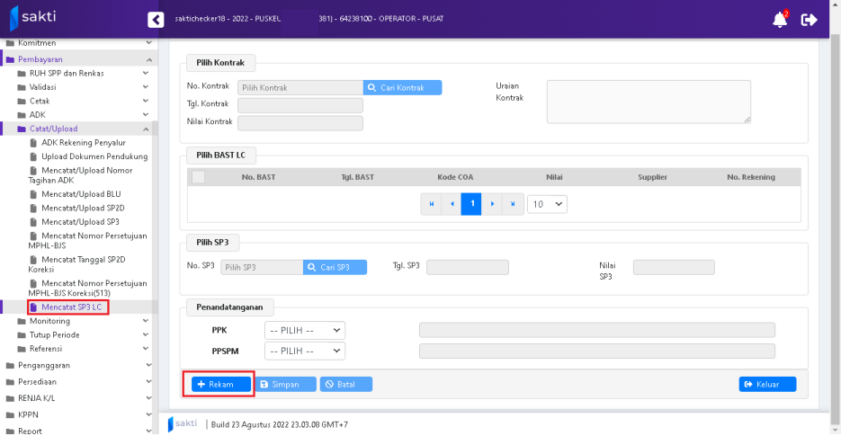 - Klik tombol “Rekam” untuk merekam BAST Kontraktual yang baru.