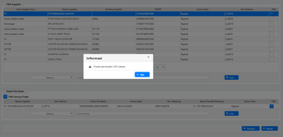 3. Klik Proses untuk melanjutkan proses pembuatan ADK Supplier;