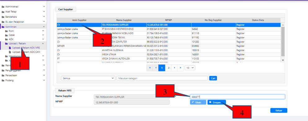 dapat dilihat bahwa data Supplier tersebut telah terisi NRS secara otomatis);