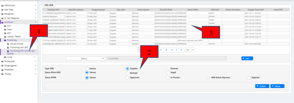 - Masuk ke Modul Komitmen → Monitoring → Monitoring ADK Kontrak dan Supplier