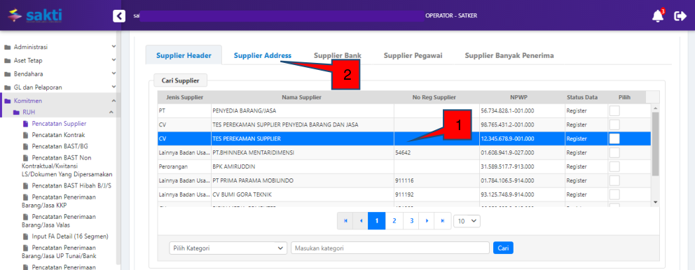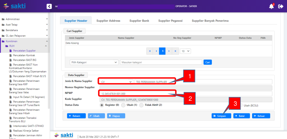 Pada Petunjuk Teknis ini, contoh yang ditampilkan adalah perekaman Supplier Tipe 2 Penyedia Barang dan Jasa.