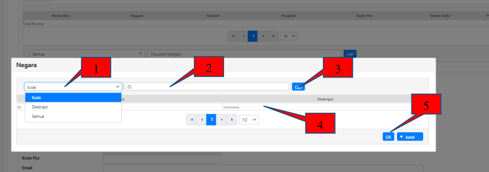 - Pilih filter yang akan digunakan, dapat menggunakan Kode ataupun Deskripsi Negara