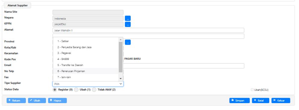 4. Pengisian tipe supplier dilakukan dengan memilih dari daftar dropdown yang telah