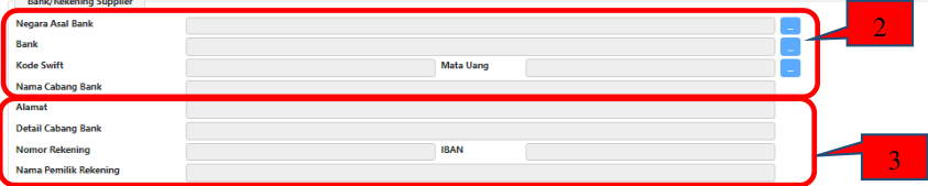 - Pengisian data pada Kolom Negara Asal Bank, Bank, Mata Uang, dan Nama Cabang