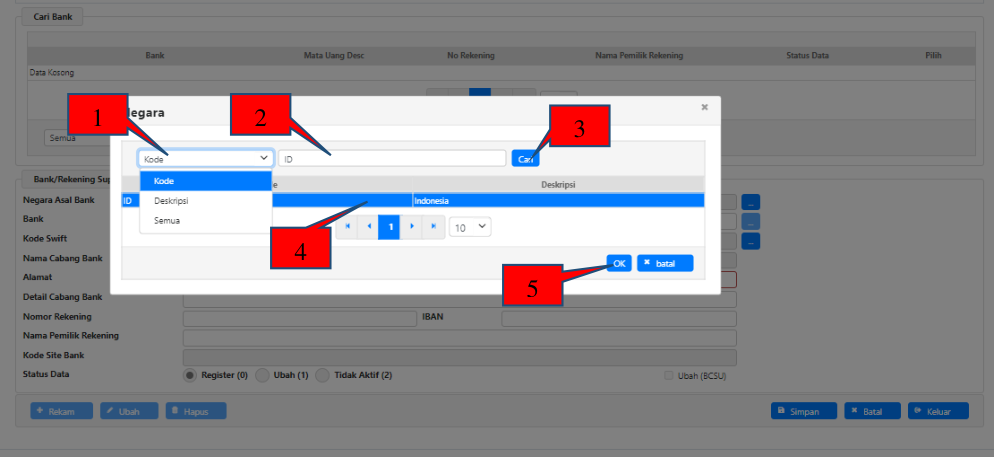 Untuk perekaman Negara Asal Bank, klik tombol […] di sebelah kanan kolom Negara Asal