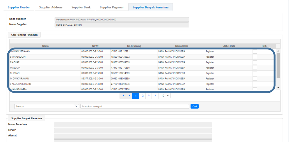 nama-nama pegawai PPNPN akan muncul di list Cari Supplier Penerus Pinjaman.