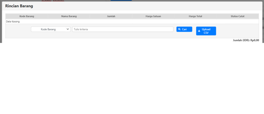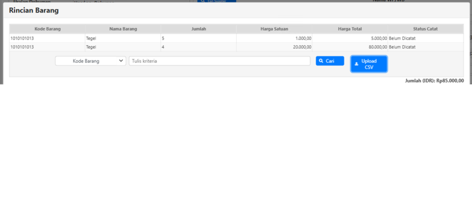 - Fitur upload CSV tersedia dan dapat digunakan pada seluruh form rincian barang.