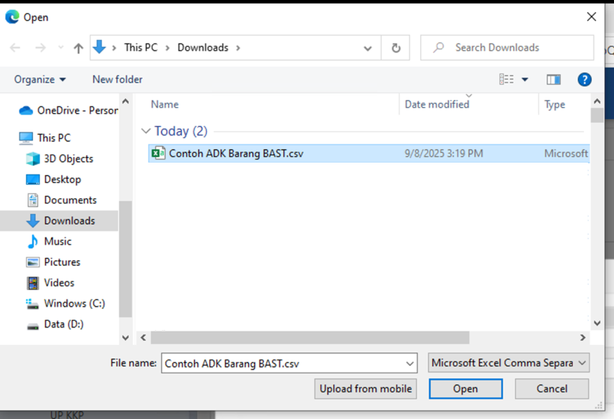 - Klik tombol Upload CSV untuk melakukan upload, kemudian pilih file ADK yang akan