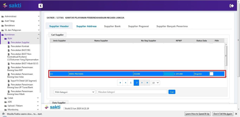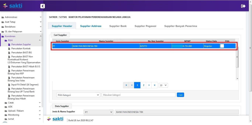 Login menggunakan user Operator Komitmen, pilih Modul Komitmen – RUH – Pencatatan Supplier.