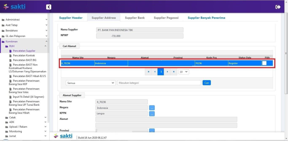 Pindah ke tab Supplier Bank / Supplier Pegawai / Supplier Banyak Penerima, pilih Supplier Address