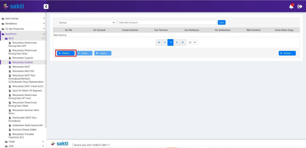 1. Pilih modul Komitmen – RUH – Pencatatan Kontrak. Untuk melakukan perekaman data kontrak