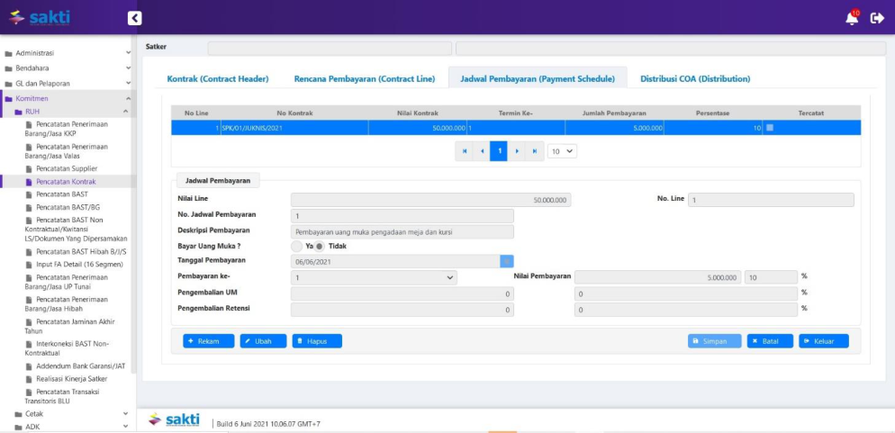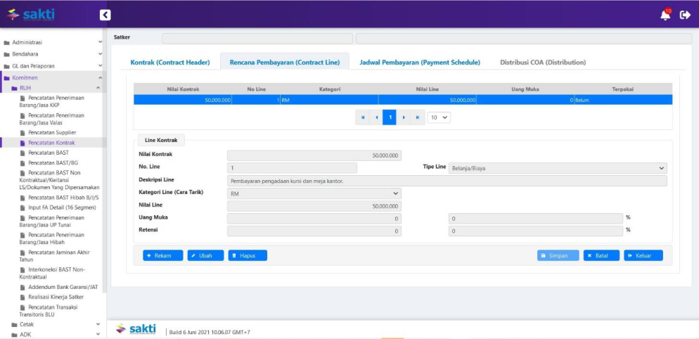 Apabila perekaman pada tab Rencana Pembayaran (Contract Line) telah tersimpan, maka tab