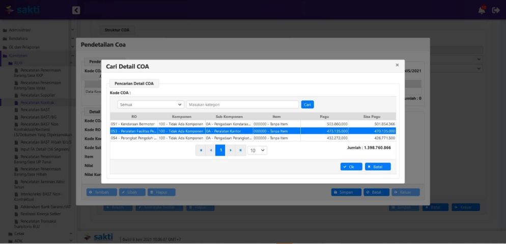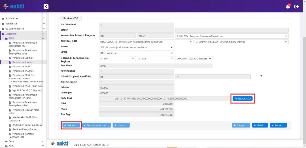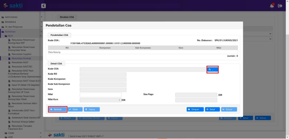 Klik tombol ‘Tambah’ untuk melakukan perekaman pendetilan 15/16 segmen COA. Klik tombol ikon