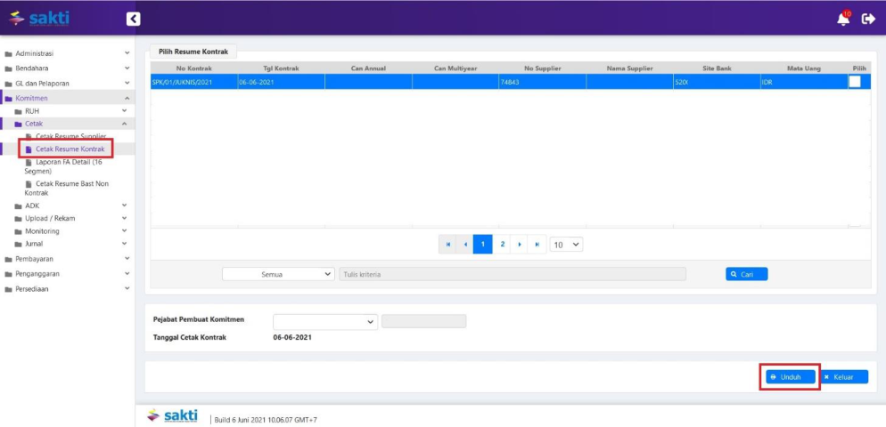 Untuk mencetak karwas kontrak terdapat pada Modul Komitmen – Cetak – Cetak Resume Kontrak.