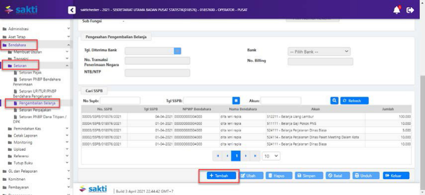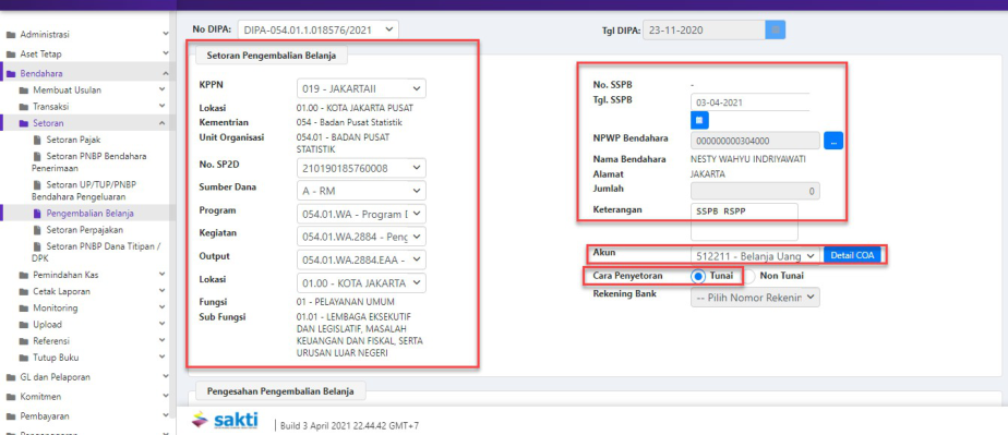 dan nominal atas pengembalian belanja tersebut pada aplikasi SAKTI modul bendahara