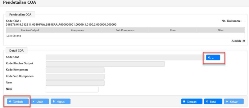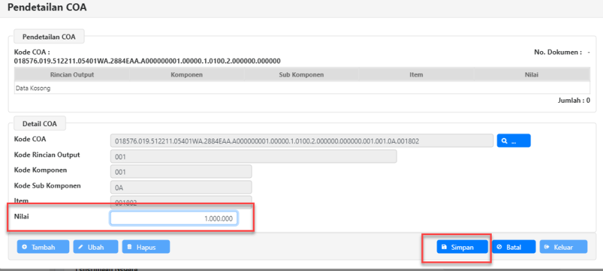  Tampilan pada aplikasi akan kembali ke form Pendetailan COA. Pastikan Kode COA sudah sesuai dengan