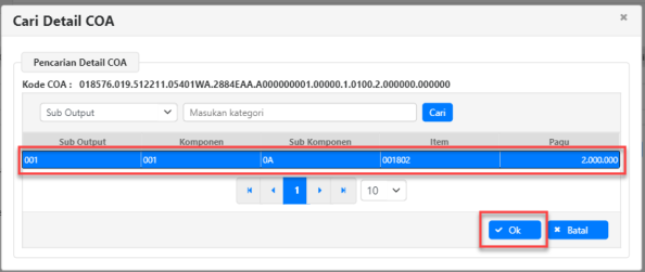  Pilih detail COA sesuai dengan Program, Kegiatan, Output, dan Akun yang sudah dipilih sebelumnya