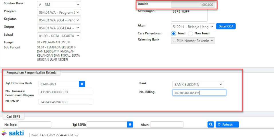 b. Lengkapi kolom Nomor SSPB, Tanggal SSPB, NPWP Bendahara, Nama Bendahara, Alamat, dan