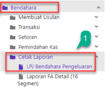 Masuk ke modul Bendahara kemudian pilih menu Cetak Laporan LPJ Bendahara Pengeluaran