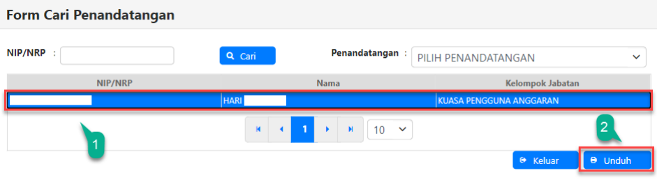 1. Setelah mengklik tombol cetak, akan muncul pop up box Form Cari Penandatangan. Pilih