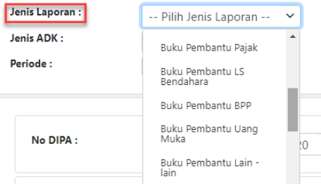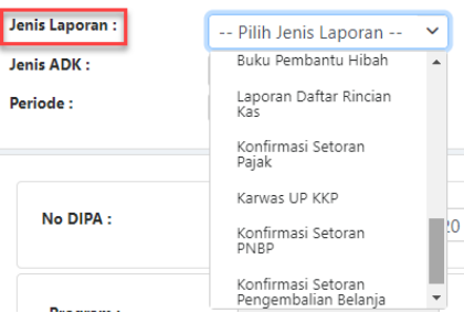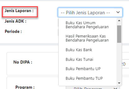 Pada kolom Jenis Laporan, pilih “Laporan Pertanggungjawaban Bendahara Pengeluaran”. Lewati