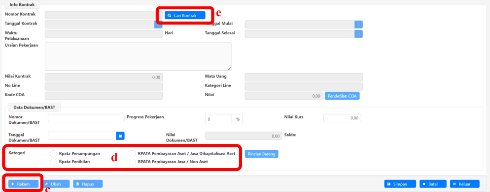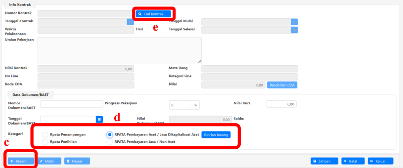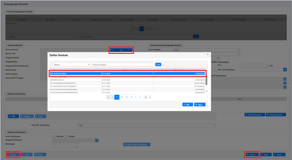 Pada form Informasi Kontrak, klik tombol ‘Cari’ untuk memilih data kontrak yang akan