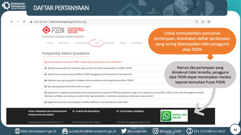 FAQ dan layanan konsultasi online dapat diakses melalui tkdn.kemenperin.go.id.